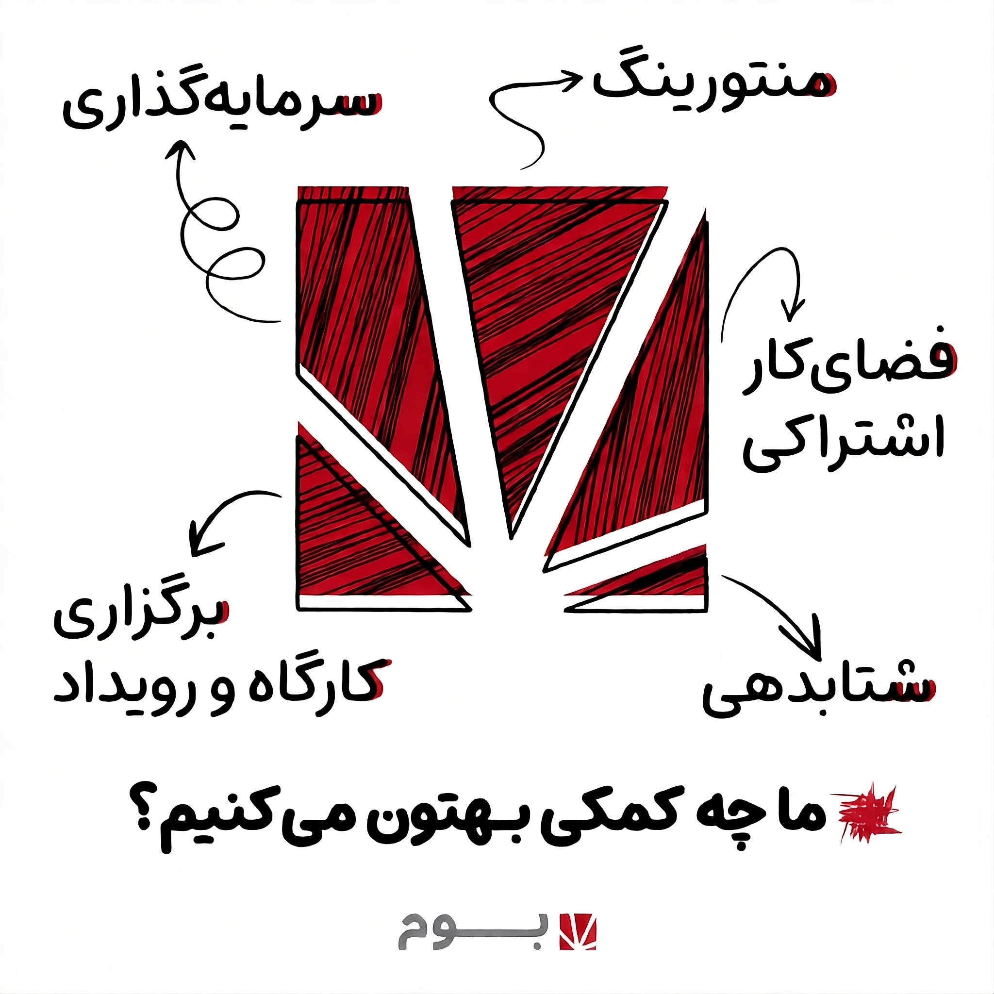 شتابدهنده بوم کمک می کنه تا موانع رو از سر راه انسان های دغدغه مندی که در راه رسیدن به آرمان خودشون در حرکتند برداره و در مسیر ساخت دنیایی بهتر به افراد کمک کنه، بنابراین سبد خدماتی که ارائه میده شامل موارد متعدد زیر میشه: